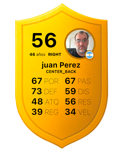 Ficha tipo FIFA, estadísticas y seguimiento para mejorar partido a partido.